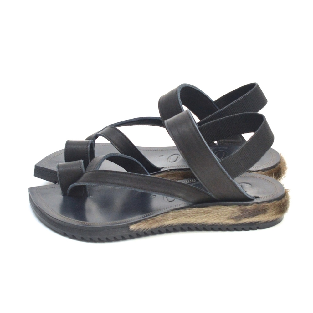 返りのいいソフトな履き心地のJUCO.定番のかたち。濃紺のおちついたカラーにヒールのアザラシファーがポイントになっていて、履き易さとカッコ良さを合わせ持つステキなレザーサンダルに仕上がっています!